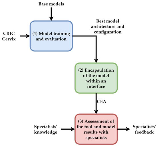Figure 2 presents the general workflow of this proposal, which consists of three steps: (1) Model training and evaluation; (2) Encapsulation of the model within a software interface; and (3) Assessment of the tool and model results with specialists. In Step (1), we use the CRIC Cervix to train and evaluate base models previously selected. We show these models in Section 4. This step is associated with our contributions A, B, and C. In Step (2), a tool named CEA was built with the best performance configuration obtained in Step (1) and is intended to offer the professionals the model results in a friendly and accessible interface. This step is associated with our contributions D and E. Finally, in Step (3), specialists evaluated the tool and provided feedback on its use.