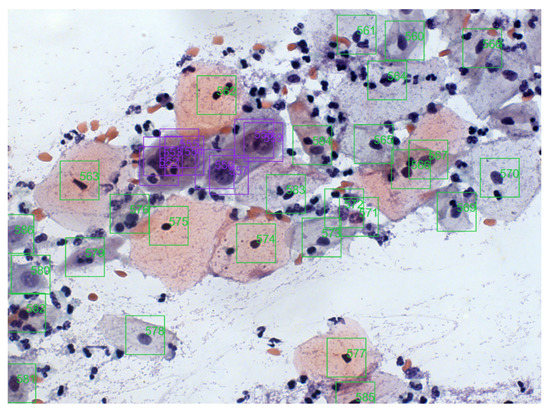 The collection images have a totality of 11,534 marks of their cells represented by bounding boxes of 100 px × 100 px. Four cytopathologists classified and revised each mark according to the Bethesda System nomenclature for cell lesions, labeled as Negative for Intraepithelial Lesion or Malignancy (NILM), Atypical Squamous Cells of Undetermined Significance (ASC-US), Low-grade Squamous Intraepithelial Lesion (LSIL), Atypical Squamous Cells, cannot exclude HSIL (ASC-H), High-grade Squamous Intraepithelial Lesion (HSIL), and Squamous Carcinoma (SCC). NILM labels correspond to normal cells, and the others (ASC-US, LSIL, ASC-H, HSIL, and SCC) correspond to lesioned cells (distinct grades). Figure 3 shows an image sample from the cervical cell classification collection, where colored boxes represent different lesions. A more detailed database description may be found in [36].