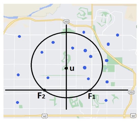 The constrained optimization model of monitoring a crowd crush risk by using the position of cell phones. The constraint is to pass through and . The blue dot is the position of the cell phone. and are constrained points. u is the optimal solution of minimax problem with radius r.