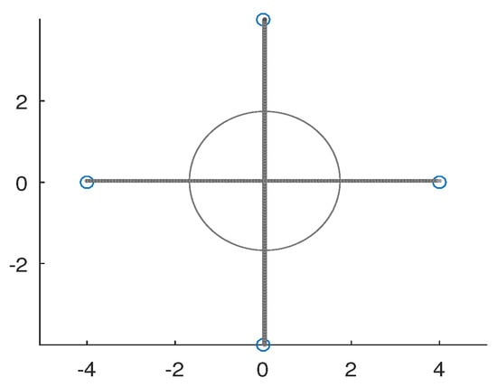 The case of with equal weights without the constraint on the circle passing through any point was covered by Drezner [] for and ∞, and the case with equal and unequal weights was addressed by Brimberg et al. [] for Nonlinear minimax problems with successive approximation methods for finding a stationary point were also studied by Demjanov [].
