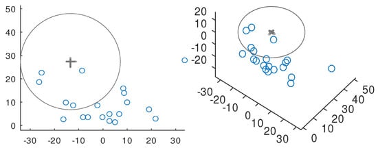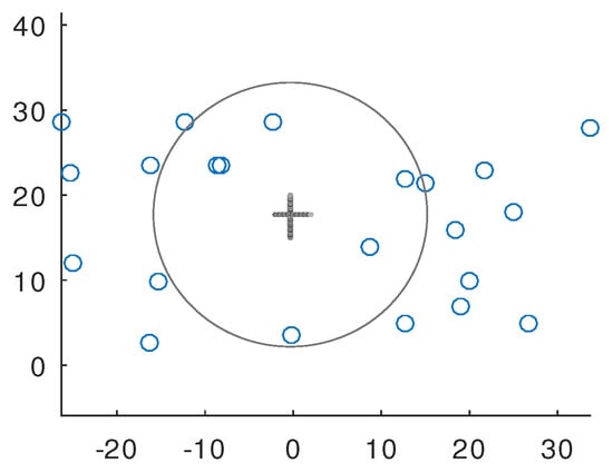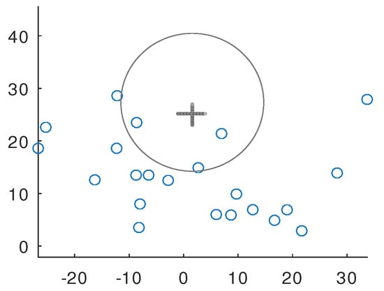 See Figure 1 for the suggested problem setting in the two-dimensional case. Here, the closeness of a circle to a set of points is given by the weighted maximum distance from the circle to the points. Denote, by , the center of a circle that passes through the two points and , and, by , the n-dimensional vector