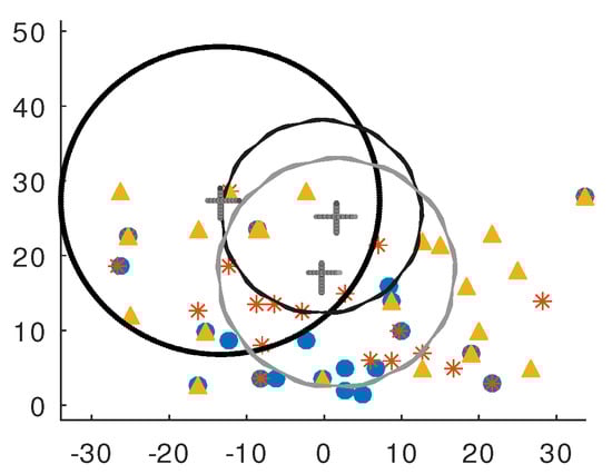 The constrained optimization model (the specific time t) of finding a circle in 2D that is closest to all cell phone 20 position points, which depend on the time t. Earlier time: solid dots; the minimax black circle. Middle time: asterisk; the minimax wavy black circle. Later time: upper-oriented triangle; the minimax wavy gray circle.