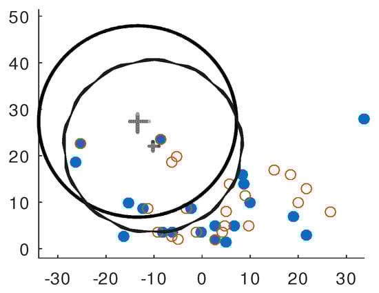 Generally, in N-dimensional, I performed the comparison study with the suggested methodology and other methodology of the data [,]. See the Table 4 with a comparison study of several methodology with the random data set from []. AUC is the area under the curve. The method result of AUC (KIM) has in Table 4 because the two distinct circles are not overlapped. DT is the decision tree method. is the k-nearest neighbor method. is the logistic regression method. NB is the Naive Bayes method. C4.5 is a decision tree with divide-and-conquer. SVM is the support vector machine method. LC is the linear classifier method []. The methodology is to find the mathematical exact solution. I find the two distinct circle with centers and radii.