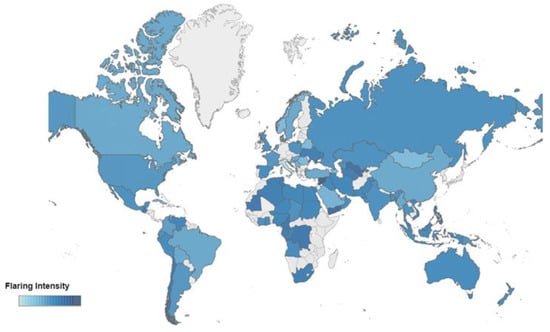 APG is mainly composed of natural gas, which can be up to 90% methane and includes smaller amounts of other hydrocarbons. Gas percentages of methane as high as 93% and as low as 7% have been documented [,]. The World Bank estimated that about 140 billion cubic meters were flared off in 2018 [] and initiated the Global Gas Flaring Partnership (GGFP) as an incentive for stakeholders to find alternative uses for flared gas. Figure 1 illustrates the global flaring intensity. Although efforts have been made to lower these figures, countries in Africa, South America, and South Asia exhibit an increase in flaring intensity despite having lower oil production when compared to other countries such as Russia. The high recorded volumes of flared gas provide an opportunity for the development of new markets for the associated gas.