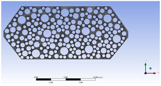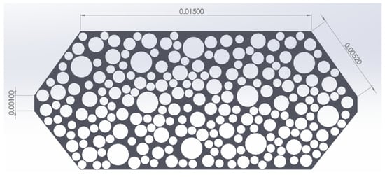 The geometry considered in this CFD study was inspired by Jafari et al. [], who used a similar geometry for their study on a biosurfactant flooding into a micromodel. Workbench 2019 R2 and Design Modeler were used to create the micromodel, which was the porous medium. The geometry, which was modified for this study, had a random pore network (see Figure 2 (measurement in meters)). The micromodel was modelled in two dimensions (2D) for faster computational speeds.