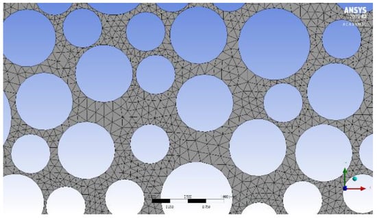 Figure 3 shows the mesh that was used, which was unstructured with triangular cells. Figure 4 shows the mesh from a magnified section of the porous medium. After experimentation, triangular elements were preferred because they gave a better quality mesh around the curves.