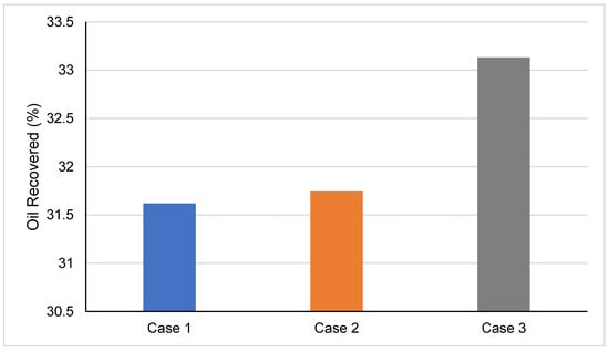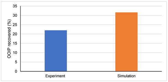 To try to check the numerical model, the oil recovery results from the simulation were compared with experimental data []. The experiment analysed immiscible gas flooding using air as the gas solvent. Case 1, with an IFT of 0.034 N/m, was selected to compare with the experiment. Air is highly immiscible with oil, which made the comparison with case 1 most appropriate. Both the experiment and the simulation were conducted at atmospheric pressure and neglected temperature effects. Figure 5 shows the comparison of the OOIP recovered from the simulation and the experiment. The simulation had a higher oil displacement (33% of OOIP) than the experiment (22% of OOIP).