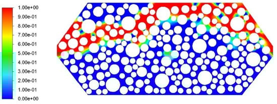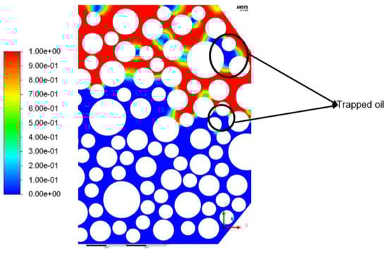 The boundary conditions were set as the velocity inlet and pressure outlet at the inlet and outlet port, respectively. The walls of the porous geometry (the outer walls and the circles) were set as the stationary wall with no slip. In this study, the effects of the contact angle for the gas/oil interphase were neglected for simplicity. At the point of initialization, the porous medium was saturated, with an oil density of 870 kg/m3 and a viscosity of 0.087 kg/ms. An initial gas flooding was conducted at a velocity of 0.001 m/s with a gas density and viscosity calculated to be 0.884 kg/m3 and 1.16142 × 10−5 kg/ms, respectively []. The surface tension for the first case that was investigated was set as 0.034 N/m [,]. Simulations were carried out using the Fluent 2019 R2 CFD software.