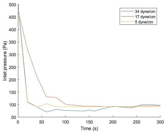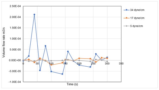 Figure 12 illustrates the volumetric flow rate for the oil produced in cases 1–3. The volumetric flow profile was not fully developed at 300 s, but from the initial stages it was clear that the surface tension had an effect on the gas fluid flow through the micromodel. At 0.034 N/m, the flow exhibited negative volumes, which could be interpreted as backflows. The volumetric flow at 0.005 N/m experienced little to no resistance and was comparatively the steadiest of the three.