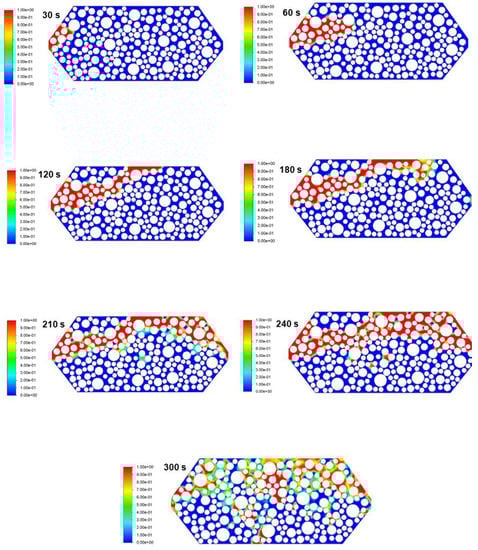 Figure 9 shows the flow of APG in case 1 at different times. The gas phase is represented by the red colour, while the oil phase is blue. A fingering effect was seen almost immediately, as the gas fluid formed a path through the crude oil. From the figure, the breakthrough occurred at 210 s. A breakthrough is defined as a point at which a fluid that was previously isolated from production gains access to a production site or wellbore.