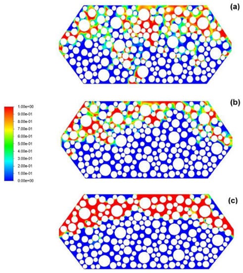 Comparison of oil displaced at 300 s for (a) 0.034 N/m (case 1), (b) 0.017 N/m (case 2), and (c) 0.005 N/m (case 3). The blue region represents the volume fraction of oil, and the red represents the volume fraction of APG.