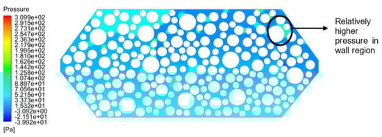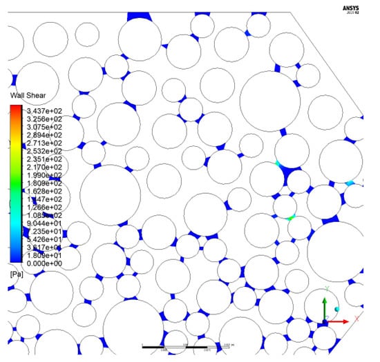 Figure 13 shows the contours for pressure within the porous domain for case 3. From the figure, the path through which the gas fluid flowed exhibited the lowest pressure. This held true within the domain but not near the walls of the porous medium, which had relatively higher pressure. When compared against the contours of wall shear stress, as seen in Figure 14, the pressure along the walls was identical. The three cases showed identical contours for pressure and shear stress.