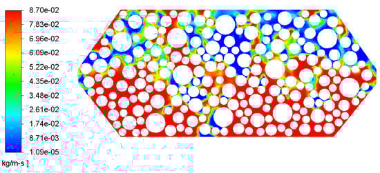 After testing different laminar and turbulence models, the k-omega SST model was selected for the simulation, as it gave the best convergence of residuals when compared to the laminar and standard k-epsilon models. Residuals give the magnitude of error for the governing equations as the iterations progress. The residuals for velocity, k, and omega were <1 × 10−4, while those of continuity were <1 × 10−3, which were within an acceptable range. This model was previously used for porous models with some success [].