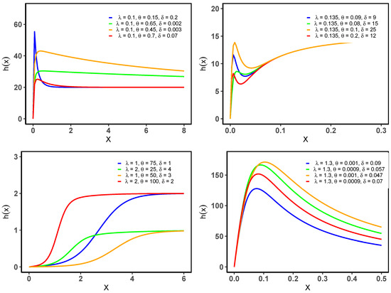 It is understood that for . Figure 1 and Figure 2 display the pdf and hrf of the HEB distribution for different parameter values, respectively.