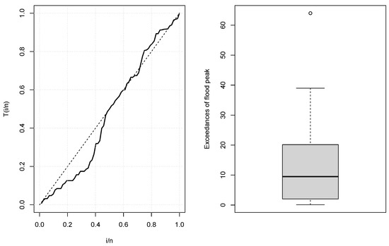 TTT plot (left) and box plot (right) for the Kiama Blowhole data.