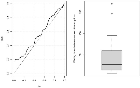 Here, the considered data set is the waiting times between consecutive eruptions of the Kiama Blowhole used in [12] to fit the HEE distribution. Figure 5 displays the TTT plot and box plot for the data, and we can see that the observations are right-skewed and with an increasing hrf that is applicable under the HEB model.