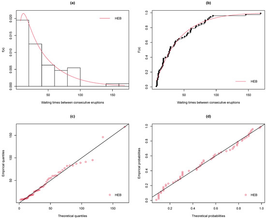 The ML method is used to estimate the unknown parameters of the HEB model, and the model’s performance is evaluated using well-referenced information criteria and goodness-of-fit statistics. The smaller values of the Akaike information criterion (AIC) and Bayesian information criterion (BIC) and the large value of the estimated log likelihood (log L) indicate the model adequacy. The goodness-of-fit statistics are evaluated by employing the Kolmogorov–Smirnov (KS) statistic and associated p value, Anderson–Darling (AD), Cramér–von Mises (CM), and average scaled absolute error (ASAE) statistics (see [17]). The smaller the goodness-of-fit measures, the better the fit.