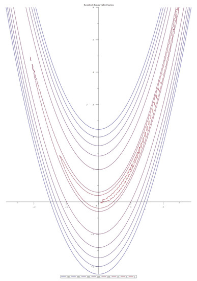 The Rosenbrock function of two variables, considered in Section 4.3, was introduced by Rosenbrock [18] as a simple test function for minimization algorithms. We chose as the initial point. We applied algorithm – with , using 400-digit accuracy. Algorithm (4) is basically Newton’s algorithm.