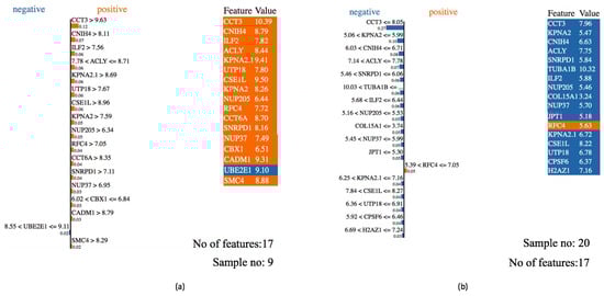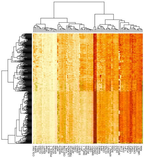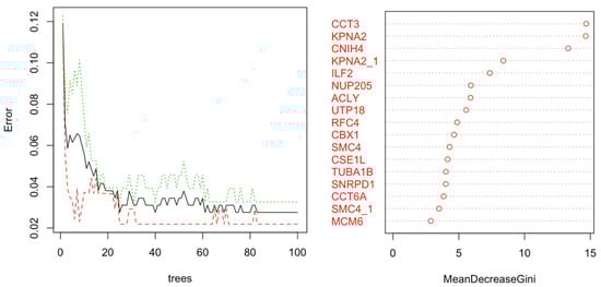Since all 22,269 genes are not responsible for HCC, and there might be multicollinearity in the features, we instead focused on the top 100 genes (Figure 2) in terms of PC loading. To identify the most 100 important variables/genes, the above PCA technique [32,33] was employed. The top 17 genes were obtained from variable importance ranking [34]. Moreover, random forest was used for classification, and RF was the average of multiple decision trees.