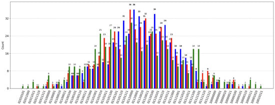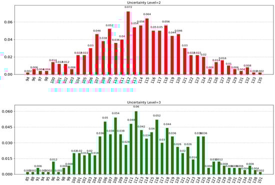 Figure 5 as color-coded based on the uncertainty level: blue for level = 1, red for level = 2, and green for level = 3. Furthermore, capital values corresponding to the quantum states and the probability they appear in the simulation are displayed with respect to different uncertainty levels in