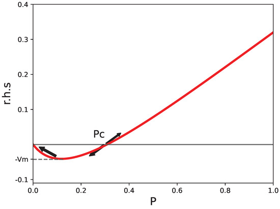 is the value at the minimum defined in Figure 1. The estimation for comes from expanding the r.h.s. in series, in the same way as we did for . Notice that if the inequality (4) is violated, the r.h.s. of Equation (2) is always greater than zero and P increases towards .