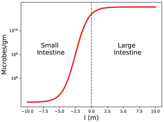 The variable l is a coordinate along the gut. The small bowel is located at , and the large intestine is located at . The mean value of the microbes/gm experiences a jump from to as we cross from the ileum to the cecum [22]. Of course, we expect the dependence to be continuous, as schematically represented in Figure 3.