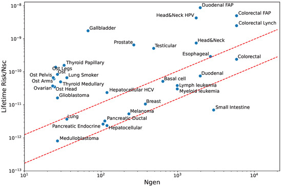 Figure 4 is a replot of the results by Tomasetti and Vogelstein [16] (see also [30]) showing the dependence of the lifetime risk for cancer in a tissue on the number of stem cells and the rate of mitotic divisions. The y-axis in the figure is the normalized risk, i.e., the risk per stem cell. This normalization allows for a comparison between tissues with high differences in the number of stem cells. The x-axis, on the other hand, counts the number of stem cell generations along a lifetime, , a number roughly proportional to the division rate, . The last term accounts for divisions along the clonal expansion phase during tissue formation. The figure shows that, for a single-cell lineage, the larger , the higher the normalized risk also.