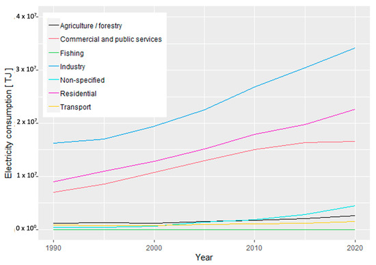 Electricity consumption by sector in Terajoules (TJ) from 1990 to 2020. Source: International Energy Agency (IEA).