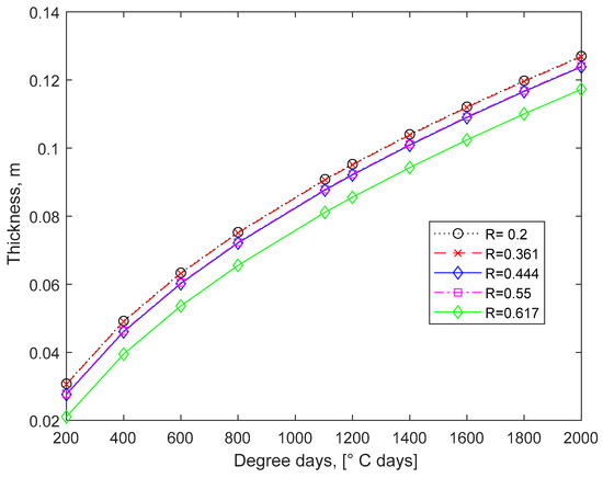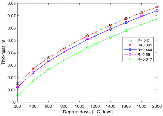 The results for the optimal thickness, in meters, of the insulating material, considering various resistances of the wall and degree days required, are shown in Figure 3. The optimal costs for four types of walls, including all constant parameters in Table 1 which are between 15 and 17 USD/m2, can be seen in Figure 4.
