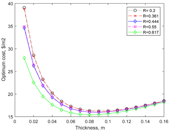 Figure 5 shows the optimal thickness results for various walls across the life cycle period, i.e., 10 years. These figures show a considerable impact on the optimal thickness, as there is a significant difference between them. This difference has implications in terms of establishing a well-defined project life cycle.