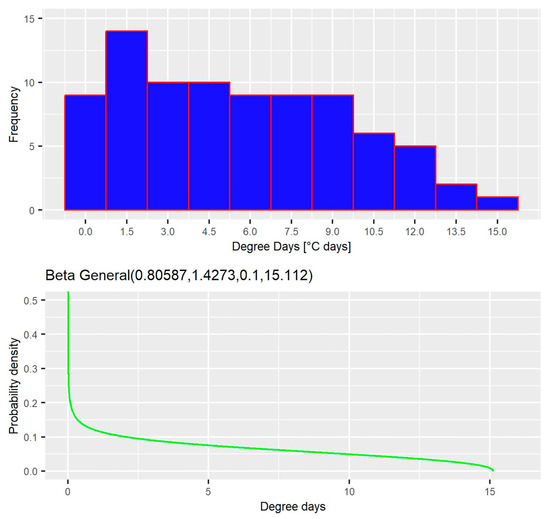 To achieve this analysis, information was obtained from the degree days required in Palestine, available on the website http://www.degreedays.net/#generate (accessed on 1 August 2023) [28]. The data contained 80 records of the degree days required in a specific winter; goodness of fit tests using @RISKTM software, www.palisade.com (accessed on 1 August 2023) [29], were performed, resulting in the best fit beta distribution, with parameters that can be seen in Figure 6.