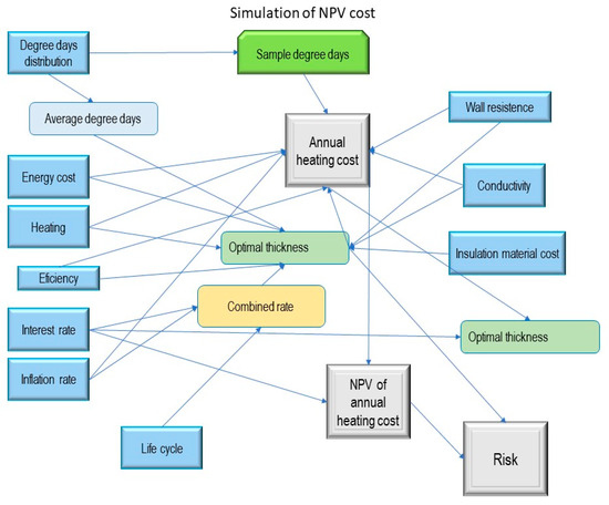 The analysis conducted calculated sensitivity using the optimum thickness of the insulating material under deterministic and stochastic conditions. Using a deterministic approach, the thickness may increase by 80% if the useful life ranges from 10 to 50 years. Stochastic analysis, incorporating the variability of the degree days required annually, showed that the probability of exceeding the value of the optimal cost suggested by deterministic analysis can range from 0% to 100%, depending on the designed duration of the project’s lifetime and the building’s operated years. However, if the inflation rate is ignored, the risk increases. This risk is transferred to whomever will pay the operating costs of heating the building. These figures call for a study to consider the financial risks of building designs. In future studies, we propose the use of risk alternative selection methodologies to analyze the tradeoffs between various characteristics of the value of the cost from the stochastic perspective.