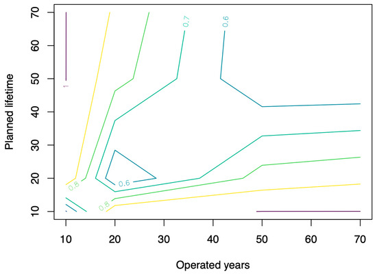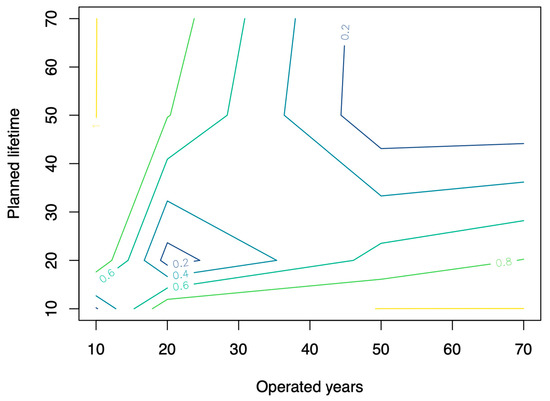From these Figures, we can deduce that the risk is always lower when the planned years of the building’s life cycle are equal to the years operated. However, the risk increases considerably when the years of operation are greater or less than the planned life of the building. In particular, the contour graph highlights that when the building is designed for a life cycle of more than 50 years and the it operates for a longer period, the risk is low, while if it is operated for a shorter period, the risk increases considerably. This is because the heating costs of operating the building for more than 50 years, due to the thickness of the insulation implemented, do not exceed the expected costs of the design.