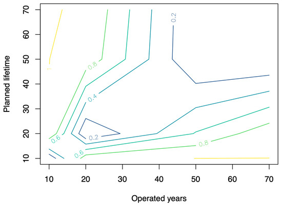 Risk contours for various lifetimes and operated years (inflation rate of 0%).