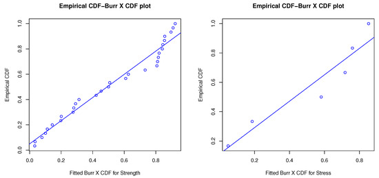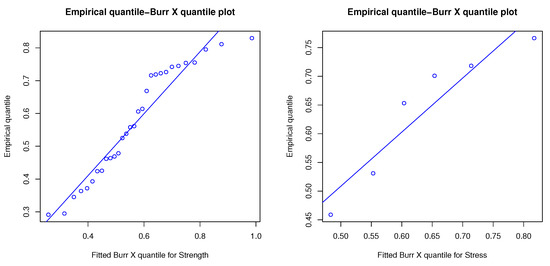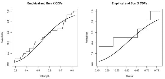 Burr [21] developed numerous distributions. Among them, both Burr X and Burr XII have been the most attractive in recent reliability studies. Meanwhile, Belili et al. [22] explored an elastic two-parameter family of distributions and provided numerous theoretical results that include vital parameters and behaviors of distribution functions, reliability measurements for the proposed two-parameter family, and applications to annual maximum floods and survival times for breast cancer patients. The proposed two-parameter family of distributions include the two-parameter Lindley distributions I and II, gamma Lindley distribution, quasi-Lindley distributions, pseudo-Lindley distribution, and XLindley distribution as special cases, but do not include the Burr types. Their proposed family of distributions could potentially be applied to the stress–strength reliability inference for the multicomponent system. Yousof et al. [23] and Jamal and Nasir [24] proposed two Burr X generators to create different families of distributions by using the CDF of a one-parameter Burr X distribution composite with and , where and are the CDF and survival function of a second distribution with parameter vector of one dimension or two dimensions, respectively. Therefore, both Burr X generalized distributions have two parameters or three parameters. Both papers developed numerous properties of these two generalized Burr X distributions that include stress–strength reliability for a one-component system. However, the practical application of stress–strength reliability was not provided. They also applied these two generalized Burr X distributions to model a random sample of 128 bladder cancer patients’ remission times (in months) and concurrently concluded that their respective extended Burr X distributions performed better than a one-parameter Burr X distribution. These two generalized Burr X distributions do not contain the current two-parameter Burr X distribution as a special case and could potentially be applied to the stress–strength reliability inference for a multicomponent system as well.