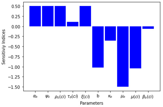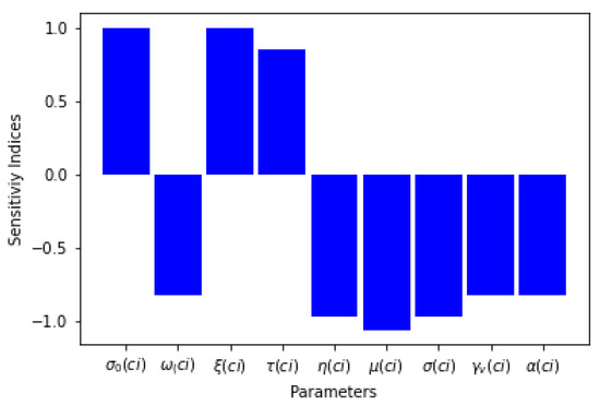 Observing the partial derivative of the with respect to each of its parameters gives the sensitivity analysis. It tells us the parameters that have the greatest impact on the spread of the disease and evaluates how the uncertainty of the parameters can affect the dynamics of the epidemic. The sensitivity index of the , with respect to its parameters, say Q, is given by: