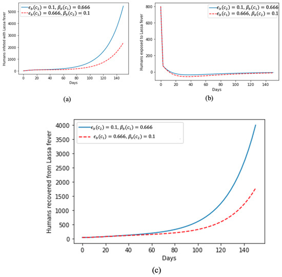 In Figure 3, we deduce how treatments help and accelerate recovery from Lassa fever, as can be seen in Figure 3c, as, despite the sharp increase in humans infected with the disease, as shown in Figure 3a, Figure 3b shows that, at the beginning of the disease spread, there was a spike in the number of humans exposed to Lassa fever disease but gradually tending towards zero as they are become diagnosed and isolated for treatment.