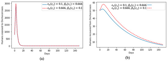 In Figure 4, we present the dynamics of the human exposure to onchocerciasis virus in Figure 4a; at the beginning of the time period, there was a huge spike; however, this later faded away and, despite the increase in the value of the rate of treatment and the proportion of effective treatment, the dynamics of the two curves remained the same throughout the time period. Figure 4b aligns with the results of human exposure to the disease, i.e., despite the spike at the beginning, a significant proportion of the human population recovered quickly but also showed that, if not properly treated and mitigated, it will take some time for people to recover from the onchocerciasis virus.