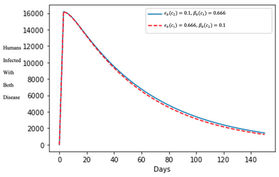 In Figure 5, after about 10 days, the number of humans infected with both diseases declined rapidly, showing the effects of treating the human population that are symptomatic to both diseases, and enabling the quick curtailment of its spread in the population even though varying the treatment rate parameters is insignificant in the shape of the epidemics.