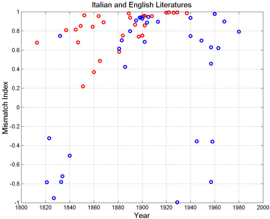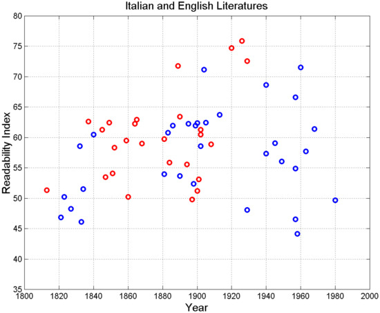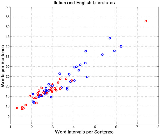Scatterplot of versus of Italian novels (blue circles) and English novels (red circles).