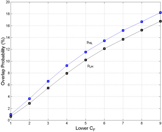 Overlap probability (%) versus (lower ); and are given by Equations (5) and (6).