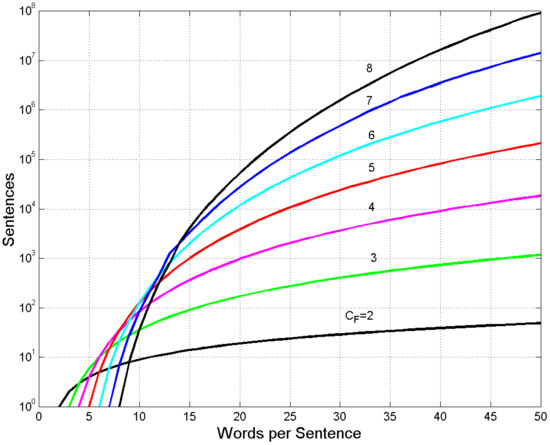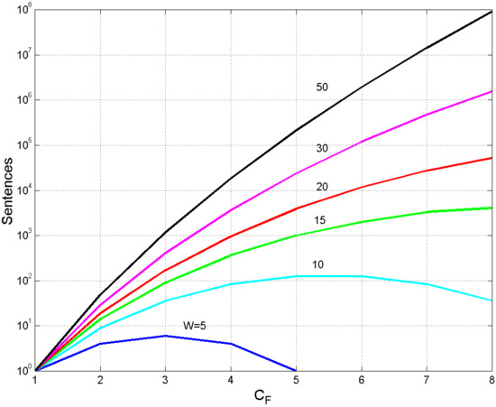 Figure 6 draws the data reported in some lines of Table 2 for a quick overview. We see how fast the number of sentences changes with for constant . For example, if words, then ranges from 1 ( to 52,698 sentences (. Maxima are clearly visible for and words at and , respectively. Values become fantastically large for larger and , well beyond the ability and creativity of single writers, as we will show in Section 4.