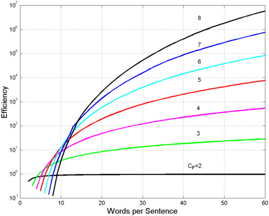 Figure 7 draws the data reported in some columns of Table 2, i.e., the number of sentences versus , for fixed . In this case, it is useful to adopt an efficiency factor , which is defined as the ratio between and for a given :