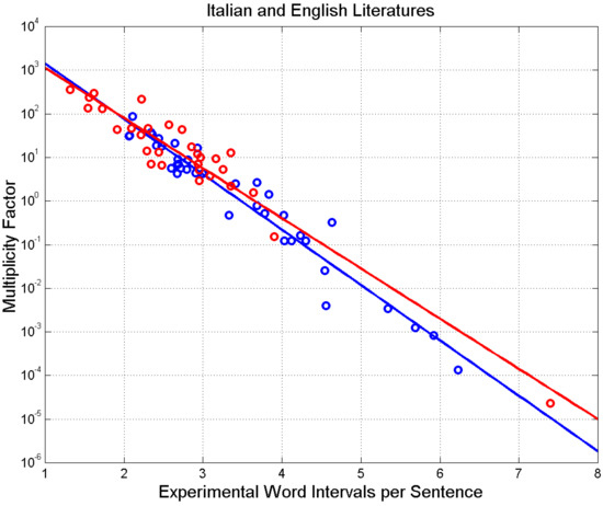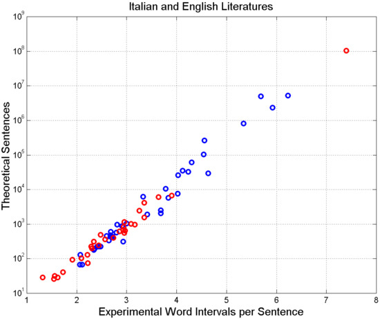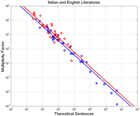 Finally, notice that each sentence conveys meaning—theoretically, any sequence of words might be meaningful, although this may not always be the case, but we do not know the proportion—therefore, the PDFs found above are also the PDFs associated with meaning. Moreover, the same numerical sequence of words can carry different meanings, according to the words used. Multiplicity of meaning, therefore, is “built in” in a sequence of words. We will further explore this issue in the next sections by considering the number of sentences that authors of Italian and English literature actually wrote.