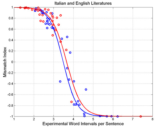 For the Italian literature in question, (correlation coefficient of linear–log values is ) when ; for the English literature (correlation coefficient of linear–log values is ), when . Therefore, novels with sentences in the range use, on average, the same E–STM buffer size of cells.