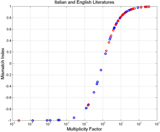 Multiplicity factor versus for Italian (blue circles) and English (red circles) novels.