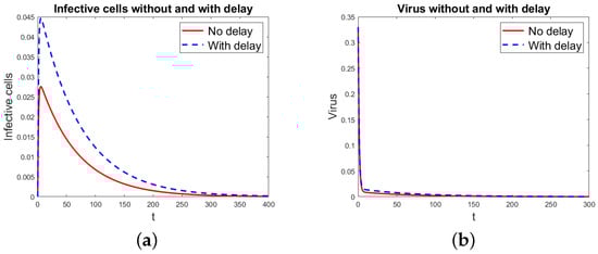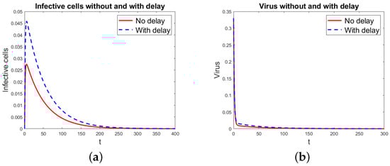 Figure 4 shows the simulation results using the virus propagation model 2 both without and with delay. The removal rate of infected cells by effector cells was changed to ×, and was kept. The graphs are for infected cells and virus particles for the data in Table 1 and Table 2. For the model without delay, the threshold index using the next-generation matrix method is = 0.8780. For both the non-delayed and delayed models, the index using the characteristic equation is = 0.8952. So, both models predict the disappearance of the infection.