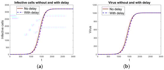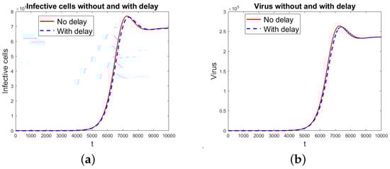 Basic virus propagation model without and with delay, but = 8 ×. (a) Infected cells. (b) Virus particles.