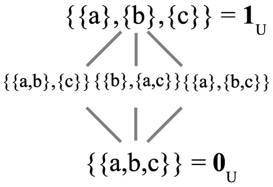 The simplified model provides a ‘skeletal’ model of both classical and quantum reality in the partition lattice (e.g., Figure 2, Figure 3 and Figure 4, Figure 7 and Figure 9). Using an iceberg metaphor, the tip of the iceberg ([35], p. 3) above the water represents the classical world with the unseen quantum world under the water. In the lattice of partitions, that “tip of the iceberg” is the top of the lattice, the discrete partition , with only singleton blocks and thus fully distinguished or classical states with no superposition. Accordingly, the discrete partition gives the partition logic version of the PII as the characteristic of classicality: