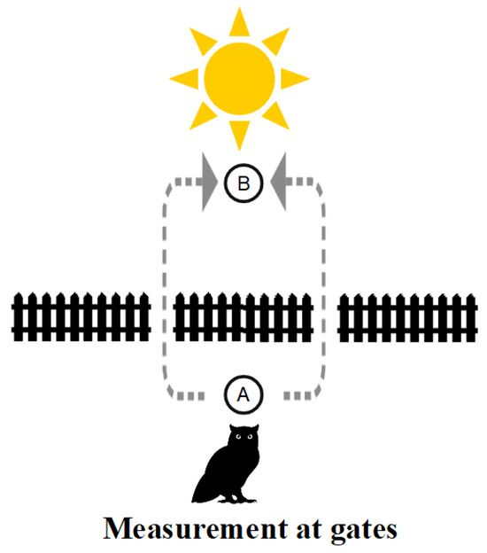 Yet another metaphor is provided by Edwin Abbott’s Flatland fantasy [30], where creatures living in a two-dimensional world (like the classical world) find changes brought about using the third dimension (like the quantum world) to be unintuitive, if not incomprehensible. Kastner [31] uses the flatlander metaphor to make similar points. In the two-dimensional world, consider Hegel’s Owl of Minerva, who only flies at night [32] (p. 13), at point A facing a fence with two gates or slits in it. During the daytime, one can see (like detection at the slits in the double-slit experiment) which gate the owl has to walk through to get to point B on the other side, as illustrated in Figure 12.
